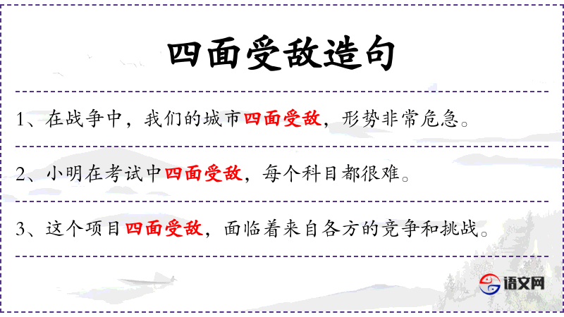 - “四面受敌”是一个成语,源自古代战争,形容被敌人包围,处境危险。