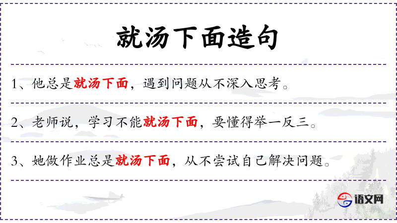 - 就汤下面:这是一个成语,比喻只做表面功夫,不深入解决问题。