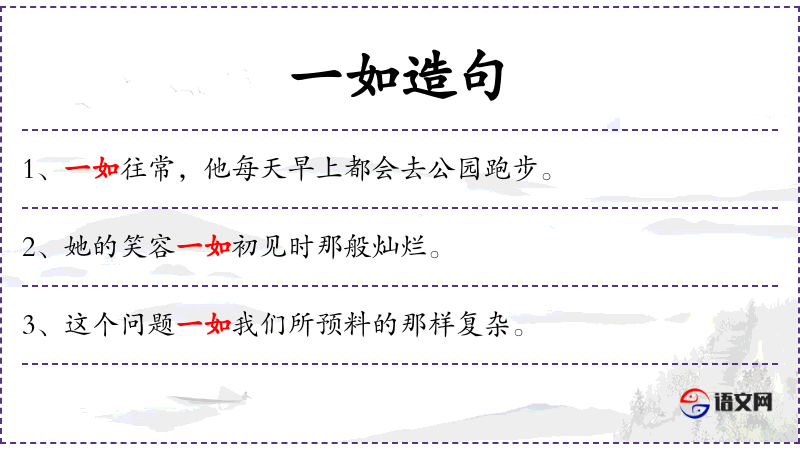 1. 【一如】 完全相同;全像; 佛家语。不二曰一,不异曰如,不二不异,谓之"一如",即真如之理,犹言"永恒真理"或本体。