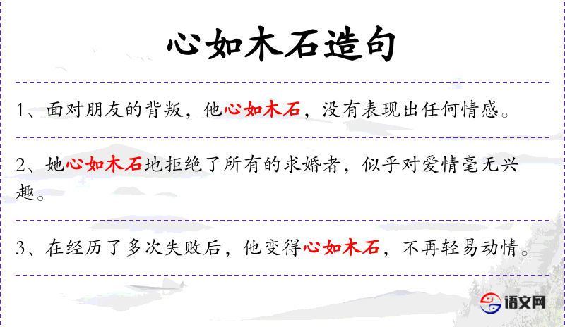 - 成语:“心如木石”在**文化中常用来形容人的心肠硬,不为情感所动。