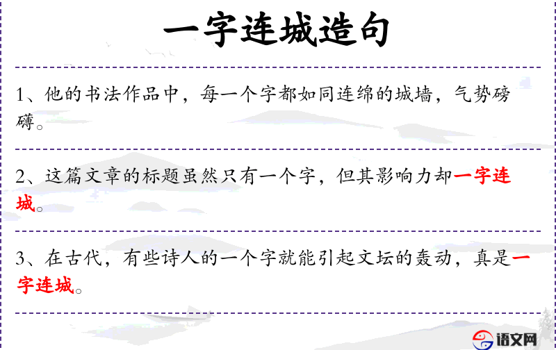 - 一字连城:成语,形容文章或言辞精炼而有力,一字值千金。