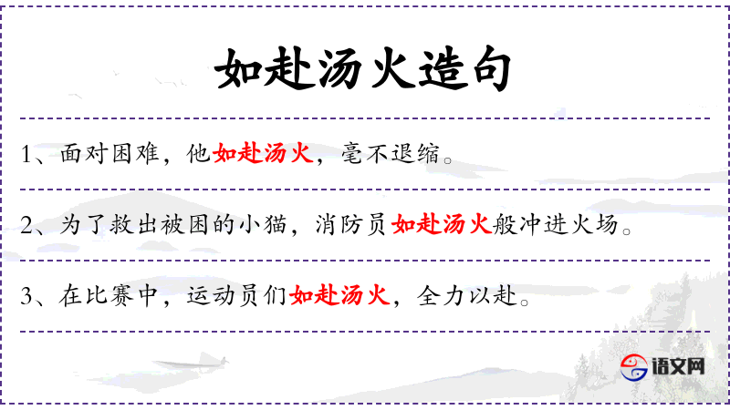 句子中的“如赴汤火”是一个成语,源自古代的战争场景,比喻不顾一切危险,勇往直前。这个成语体现了文化中对勇敢和牺牲精神的推崇。