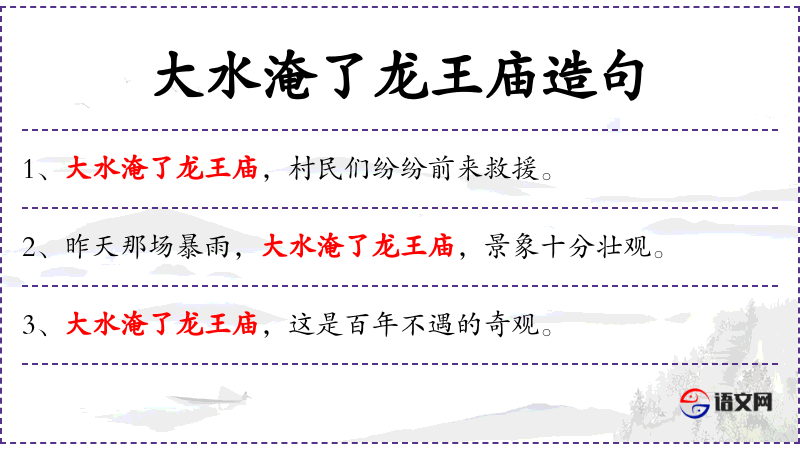 - “龙王庙被昨天那场暴雨带来的大水淹没,景象非常壮观。”