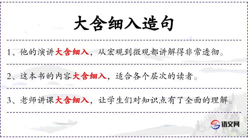 - 大含细入:这是一个成语,意思是内容既广泛又深入,涵盖了各个方面。