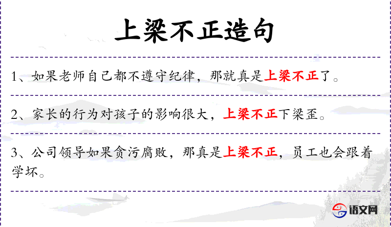1. 【上梁不正】 - 上梁:指上级或长辈。比喻在上的人行为不正,不能以身作则。