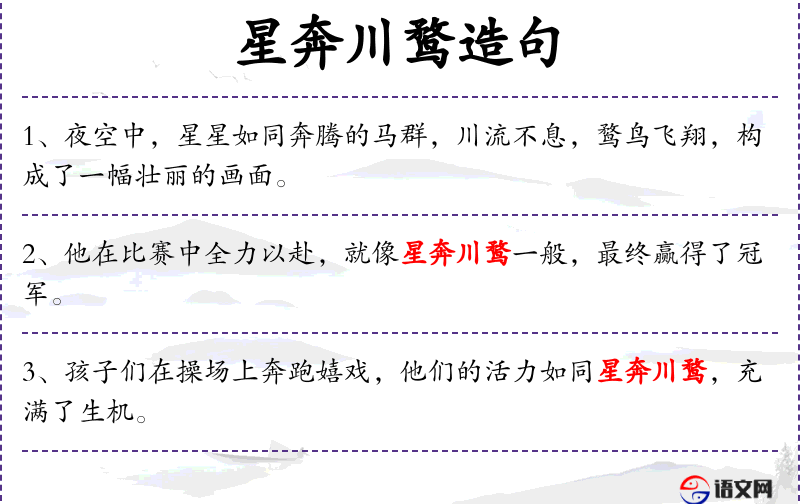 - 星奔川鹜:成语,形容事物迅速而有力地移动,如同星星奔流,川流不息。