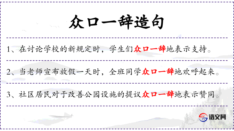- 众口一辞地:形容大家意见一致,没有分歧。