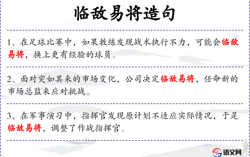 - 相关成语:临敌易将,比喻在关键时刻做出重大调整。