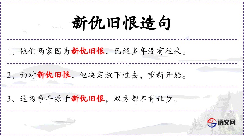 - 新仇旧恨:指新的和旧的仇恨,强调仇恨的积累和持续性。