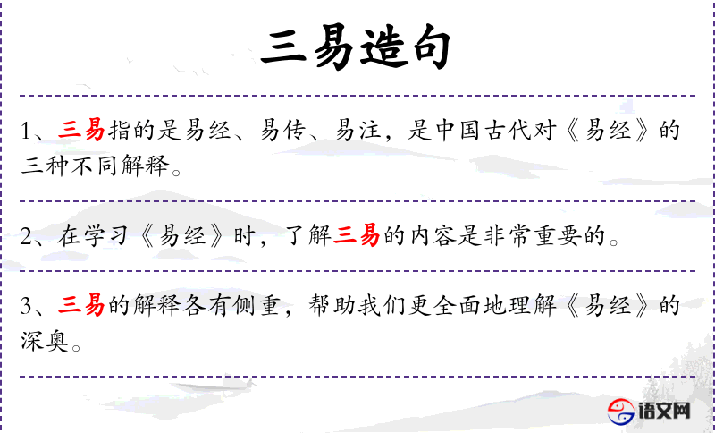 《连山》﹑《归藏》﹑《周易》的合称; 三种容易之事。"三易"所指,随文而异; 三次变换。