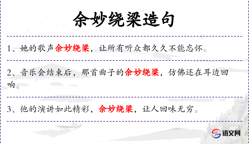句子中的“余妙绕梁”源自成语“余音绕梁”,源自《列子·汤问》:“昔韩娥东之齐,匮粮,过雍门,鬻歌假食,既去而余音绕梁,三日不绝。”这个成语用来形容歌声或音乐优美,耐人寻味。