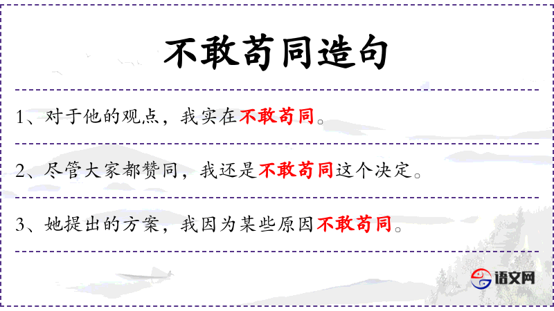 1. 【不敢苟同】 - 苟:苟且。不敢随便地同意。指对人对事抱慎重态度。