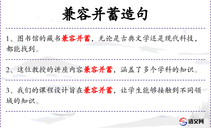 - 宾语:无明确宾语,但“兼容并蓄”隐含了宾语的概念,即各种类型的书籍。