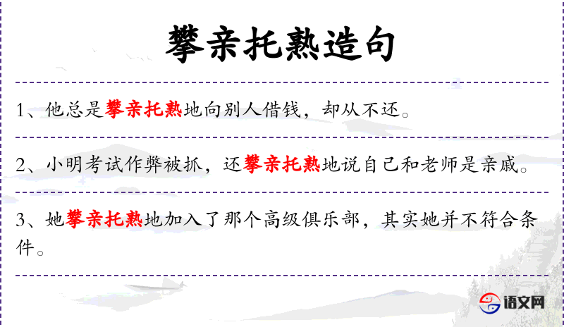 - 攀亲托熟:通过关系或熟人寻求帮助或便利。