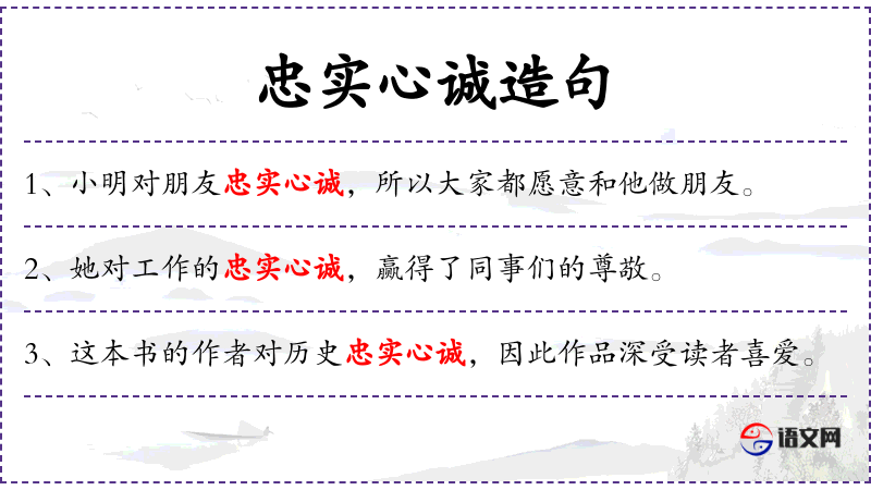 - 忠实心诚:形容词短语,表示忠诚和真诚。