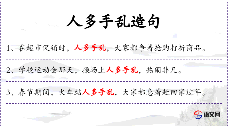 - 人多手乱:形容人多且动作混乱,常用于描述拥挤或混乱的场景。