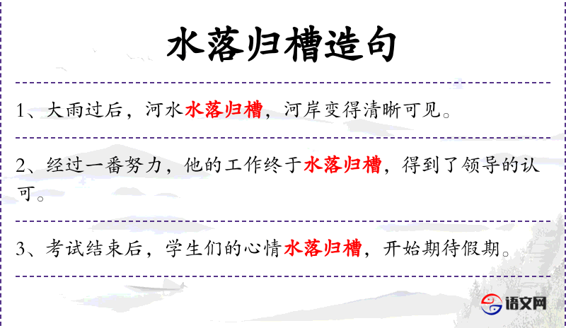 1. 【水落归槽】 四溢的洪水流入了河槽。比喻一心惦记着的事有了着落。