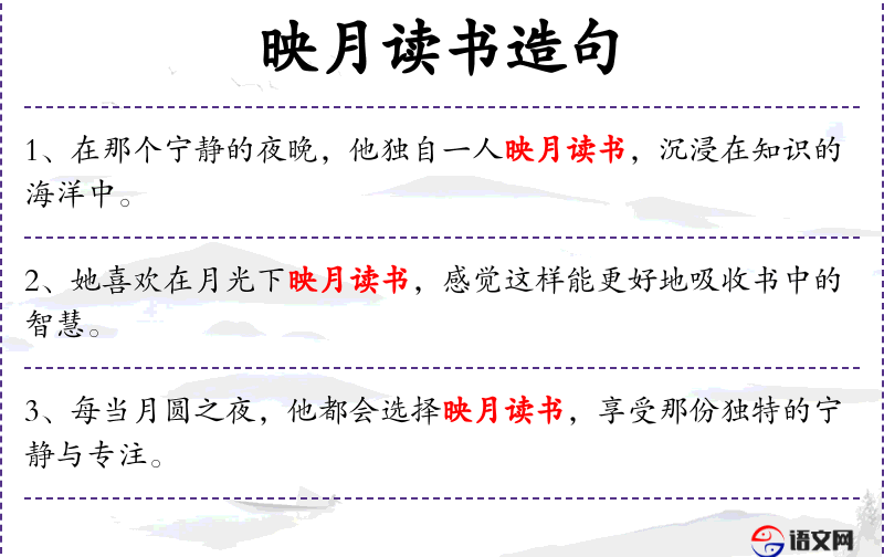 - 映月读书:动词“映月”和“读书”结合,形象地描述了在月光下阅读的情景。