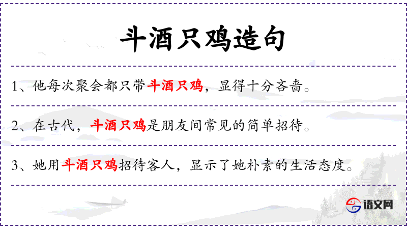 - 主语:在第一个分句中,主语是“斗酒只鸡”;在第二个分句中,主语是隐含的,指的是“斗酒只鸡”。