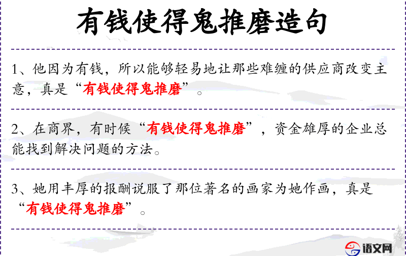 4. 【有钱使得鬼推磨】 - 俗语。形容有了钱,什么事情都可能办到,金钱万能。