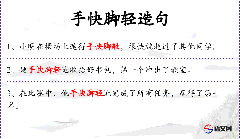 1. 【手快脚轻】 手的动作快,走路脚步轻。指人的动作轻快。