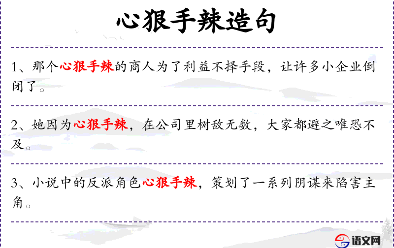 - 心狠手辣:形容词短语,形容人做事残忍无情。