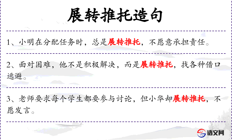 - 展转推托:表示反复推脱,不愿意接受任务或责任。