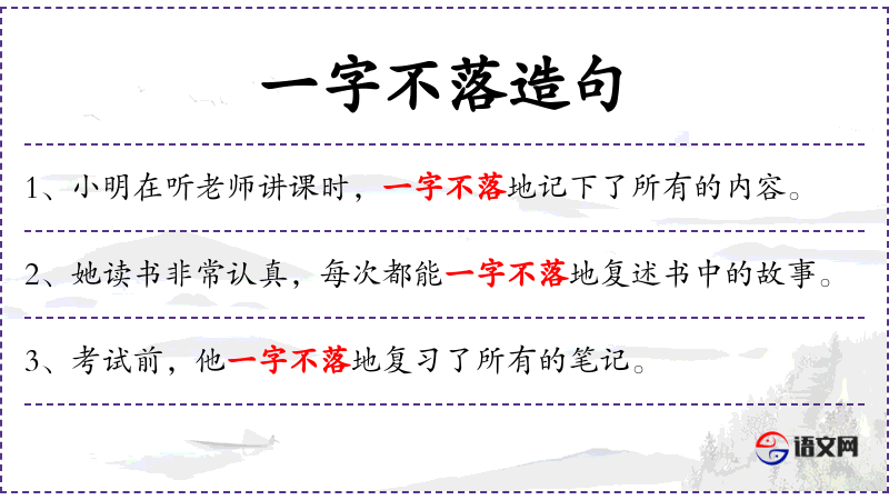 - 一字不落地:表示记录得非常详细,没有遗漏任何内容。