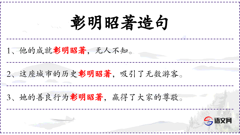 - 彰明昭著:形容词短语,意为非常明显或显著。