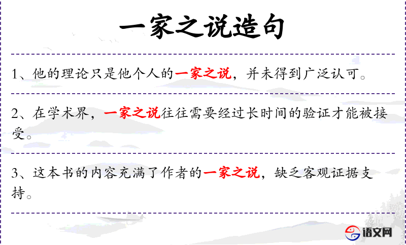 - 一家之说:指某个家庭或个人的观点、理论或主张。