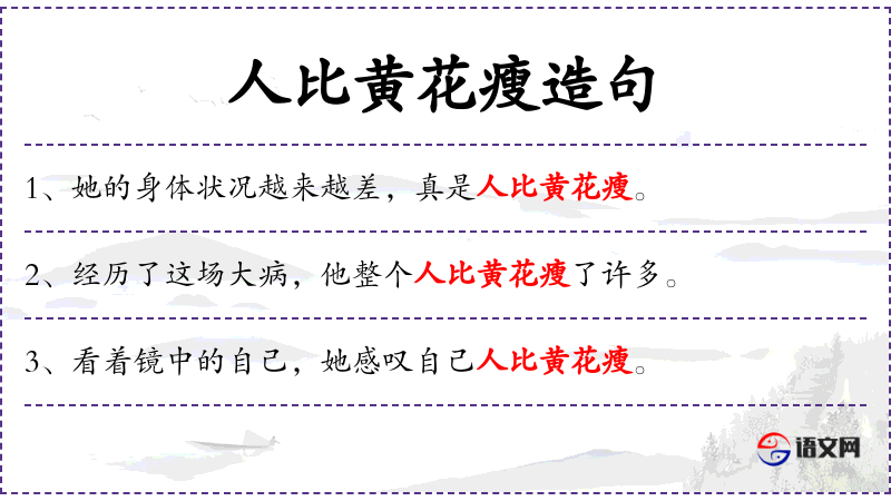 - 人比黄花瘦:成语,形容人非常瘦弱。