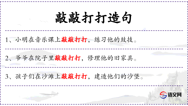 - 敲敲打打:动词短语,形容工作时的声音和动作。