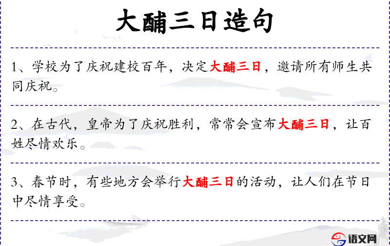 1. 【大酺三日】 酺:聚饮。封建帝王为表示欢庆,特许民间举行大聚饮三天。后用以表示大规模庆贺。