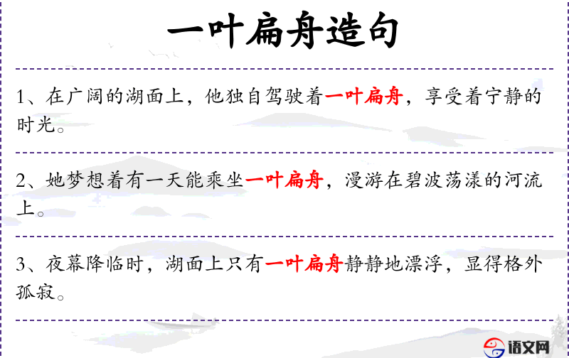 1. 【一叶扁舟】 - 扁舟:小船。象一片小树叶那样的小船。形容船小而轻。