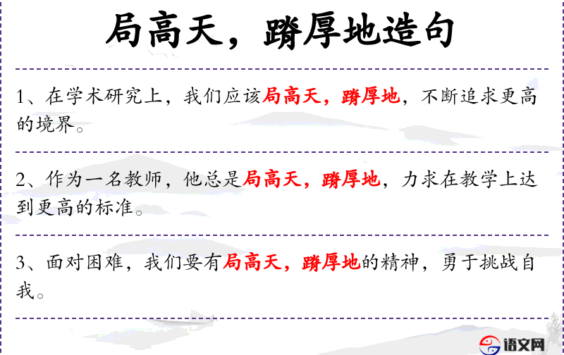 - 局高天,蹐厚地:这个成语源自《诗经》,反映了中华文化中对谨慎和勤奋的重视。
