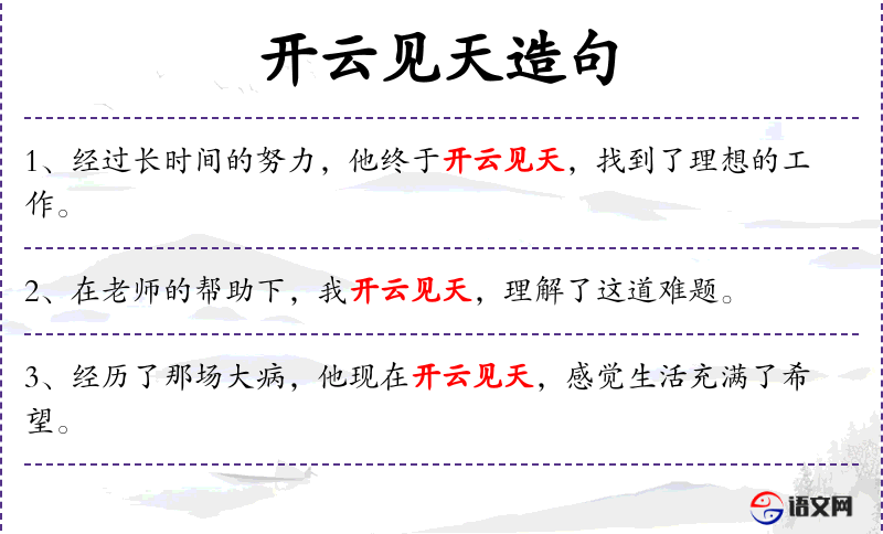 - 开云见天:比喻困难或不愉快的情况结束,事情变得明朗或好转。