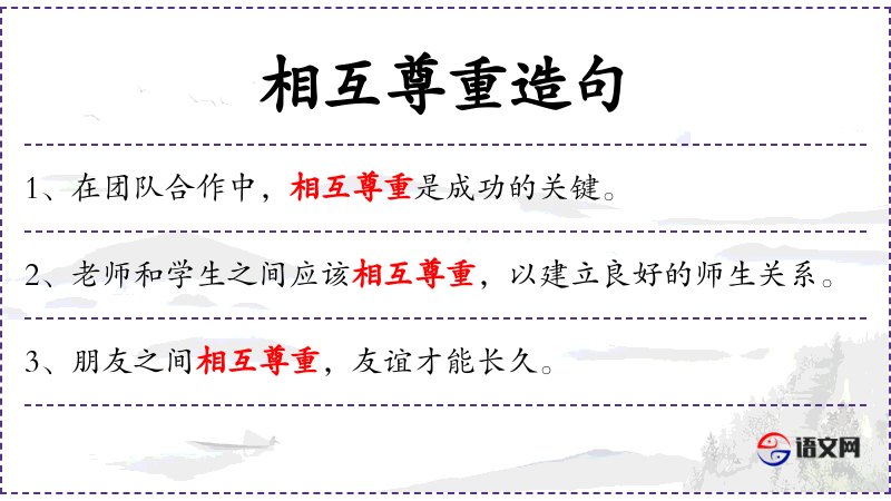 2. 【相互尊重】 - 尊重:敬重,重视。指互相重视。