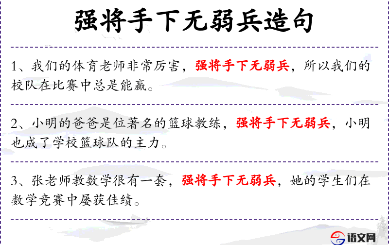句子中的“强将手下无弱兵”是一个成语,反映了文化中对领导者和团队关系的看法。这个成语强调了领导者的影响力和团队成员的素质。