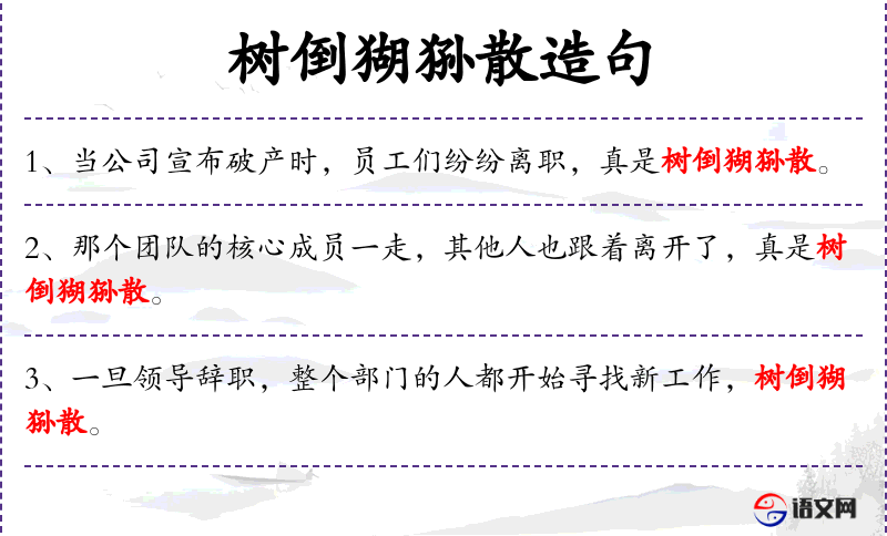 1. 【树倒猢狲散】 - 树倒了,树上的猴子就散去。比喻靠山一旦垮台,依附的人也就一哄而散。