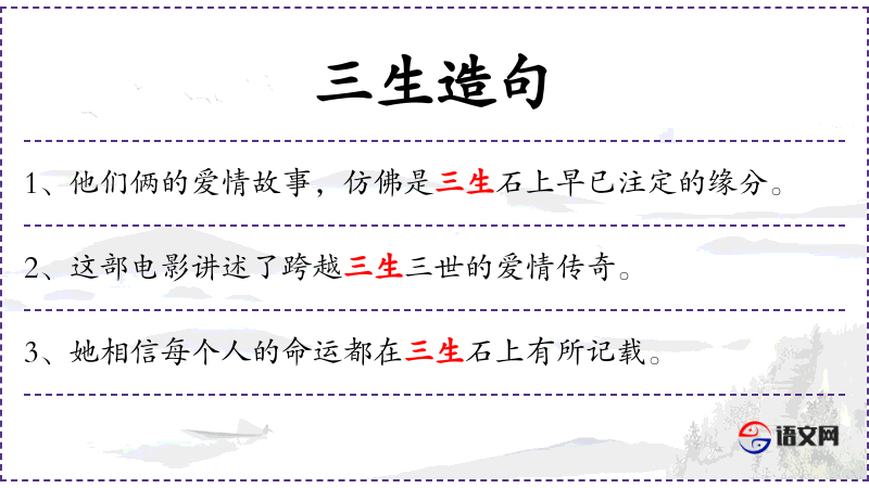 1. 【三生】 - 佛教语。指前生、今生、来生世说三生如不谬,共疑巢(巢父)、许(许由)是前生。