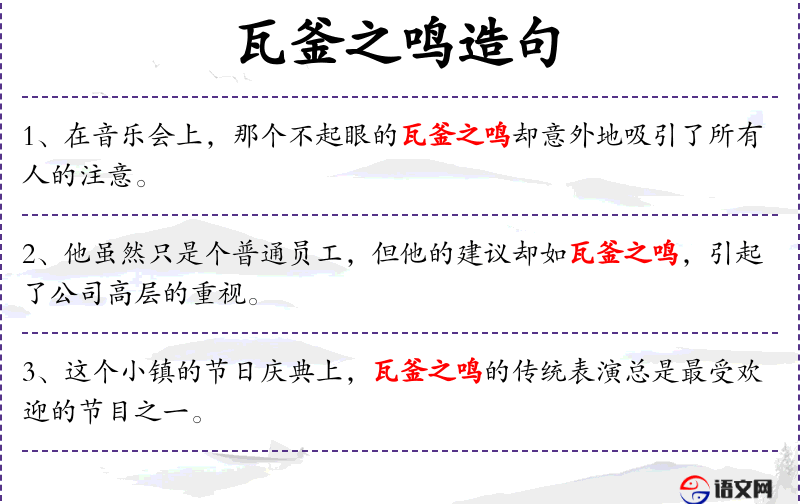 1. 【瓦釜之鸣】 瓦釜:沙锅,比喻庸才。声音低沉的沙锅发出雷鸣般的响声。比喻庸人占据高位。