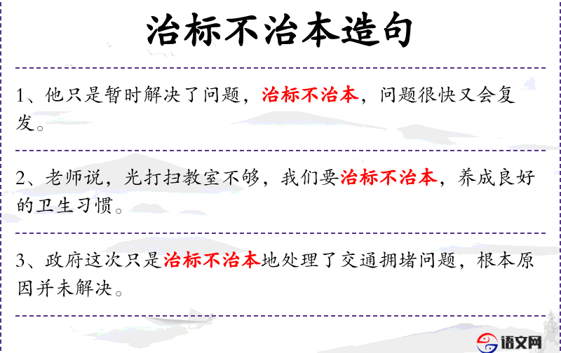 1. 【治标不治本】 - 治:治理;标:树梢,指事物枝节、表面。仅就显露在外面的毛病加以应急的处理,而不是从根本上加以治理。形容处理问题不彻底。