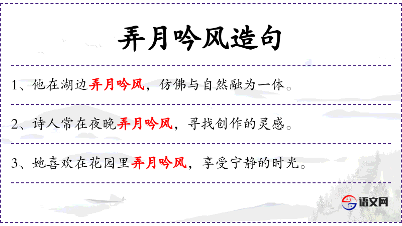 - 弄月吟风:这是一个成语,意思是形容在月光下吟诗,享受自然美景。