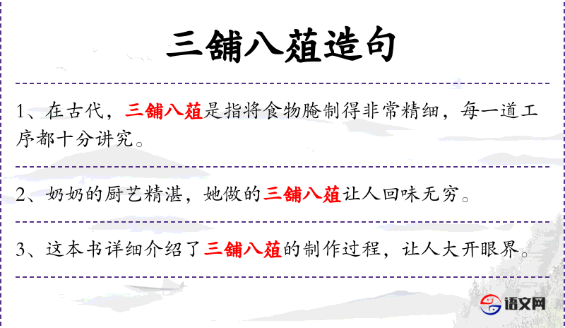 1. 【三舖八葅】 - 泛指精美的肴馔。亦借喻精美的诗文。