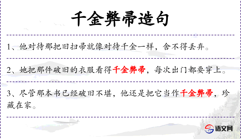 - 千金弊帚:比喻极其珍贵的东西,即使破旧也不舍得丢弃