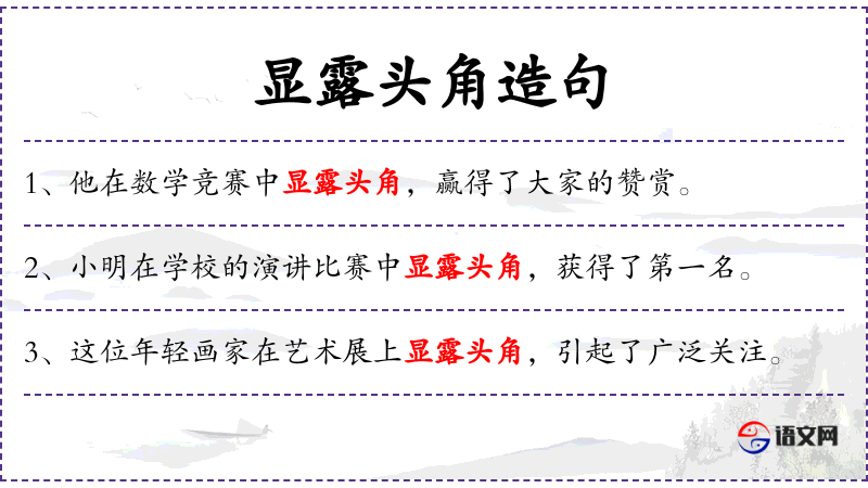 3. 【显露头角】 - 露:显露。头上的角已明显地突出来了。指初显露优异的才能。
