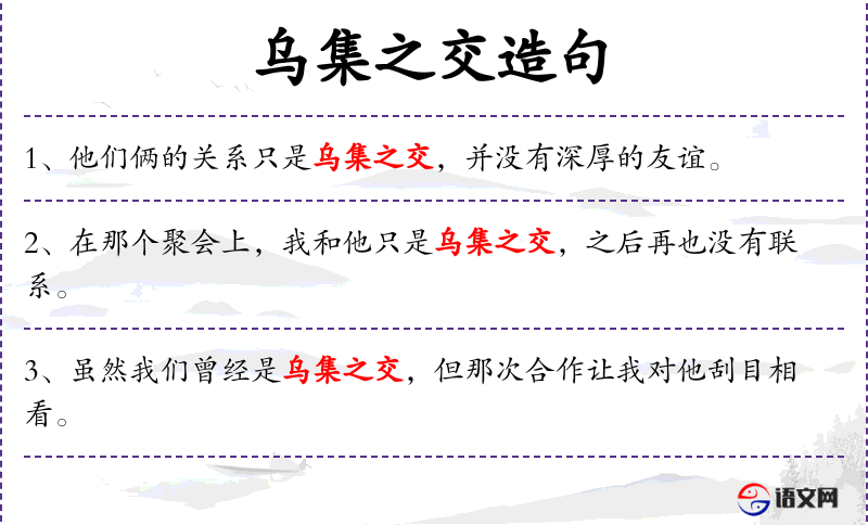 - 乌集之交:这个成语源自**古代,用来形容人与人之间的关系不深,只是表面上的交往。