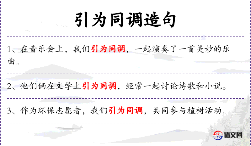 - 引为同调:动词短语,表示因为共同的兴趣或观点而相互认同。