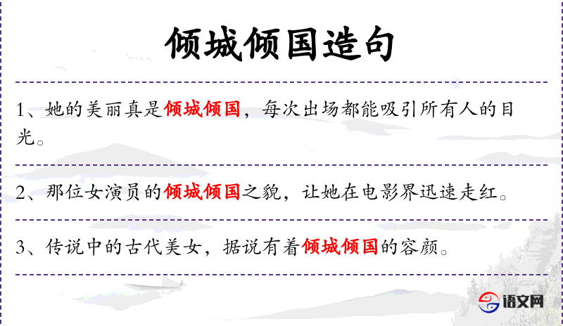- 句子中的“倾城倾国”是一个成语,源自古代文学作品,如《诗经》中的“倾城之恋”。