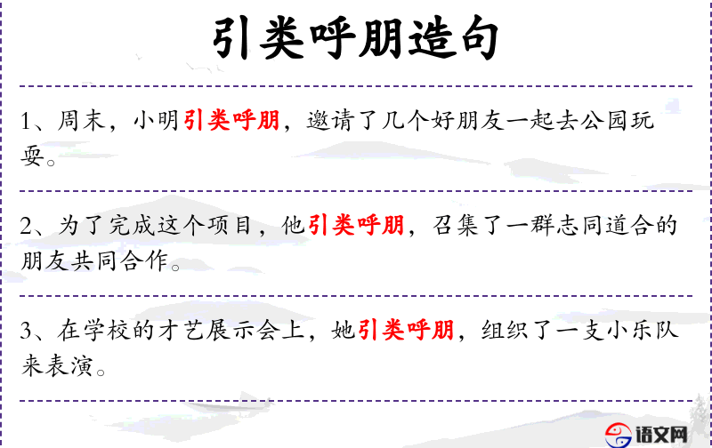 1. 【引类呼朋】 引:招来;类:同类;呼:叫。指招引志趣相同的人。